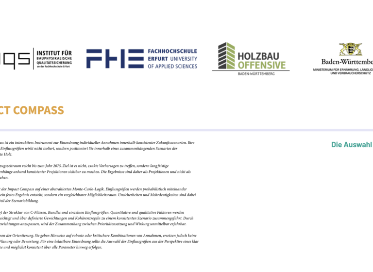 Der Impact Compass wird im Rahmen des Projekts als Web-Tool entwickelt, um die Zusammenhänge innerhalb der Wertschöpfungskette zu beschreiben und Entscheidungsträgern die Prozesse verständlich zu machen – insbesondere, um kausale Zusammenhänge aufzuzeigen.